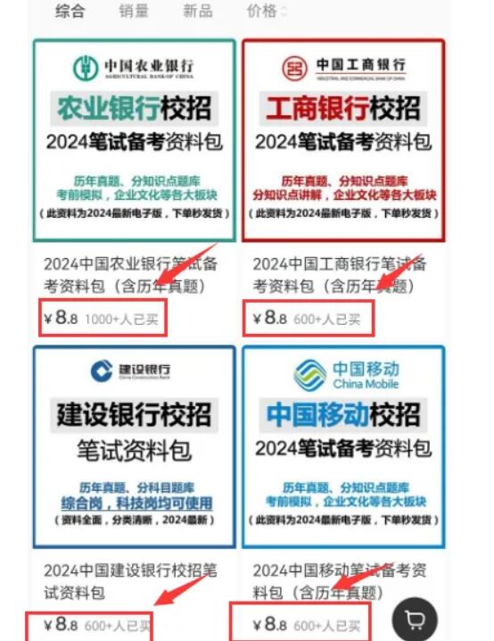 这个项目还是挺有意思的,单价不高8.8元一份,但是优势就是,不只是可以卖一份资料,每个银行以及移动联通电信,这些公司的招聘笔记资料,都可以卖。这种项目,也算是属于虚拟资源,一个零成本的项目,资料其实在网上免费的都能搜索到,但是很多资料,可能不是很完善,别人把这些资料全部整合到一起,打包出售,没想到销量还不错。