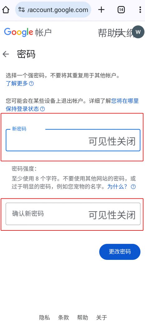 3、设置新密码, 设置至少8位新密码并确认后, 点击右下角”更改密码“ 按钮
