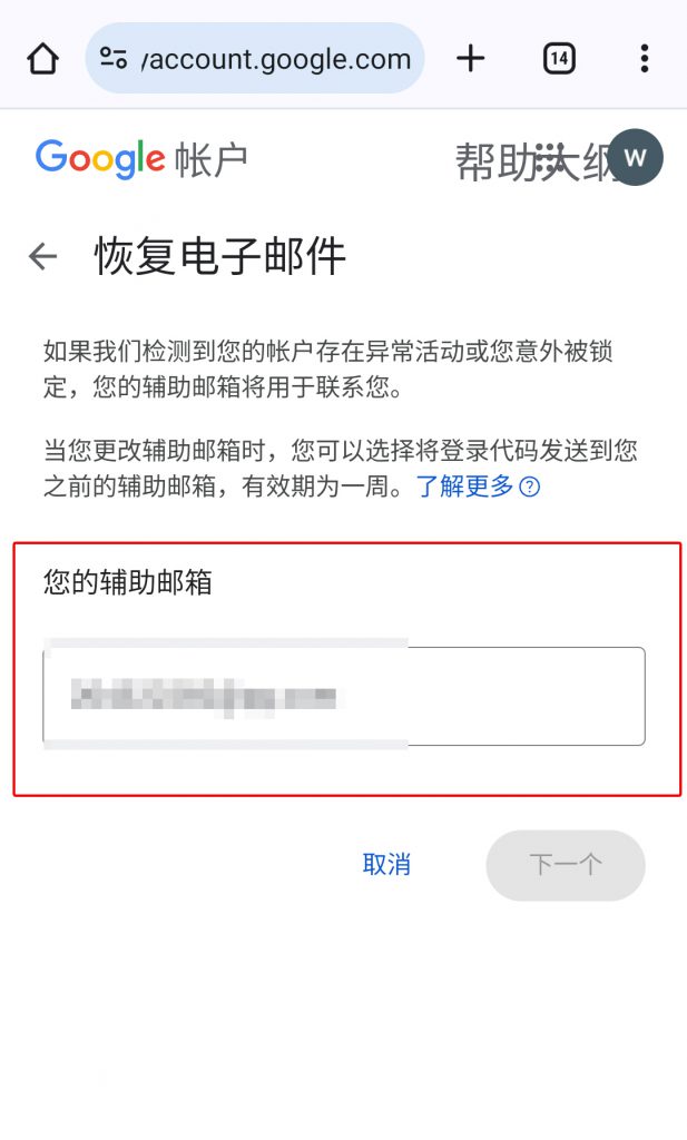 3、恢复电子邮件 里面填写邮箱地址(也可以填写国内邮箱地址),点下一个,进行验证 就可以了