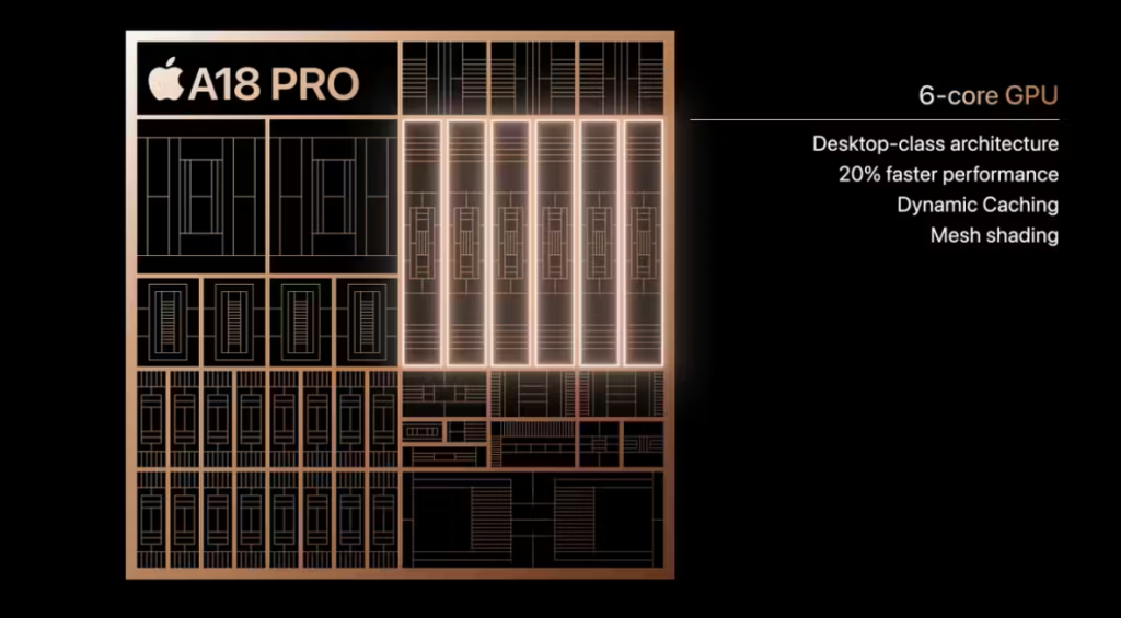 与 2023 年的 A17 Pro 一样,今年的 A18 Pro 拥有六核 CPU,包括两个性能核心、四个效率核心和改进的机器学习加速器。与 A17 Pro 相比,A18 Pro 可将游戏中的光线追踪速度提高 20%,并实现 2 倍更快的 ProRes 视频编码。