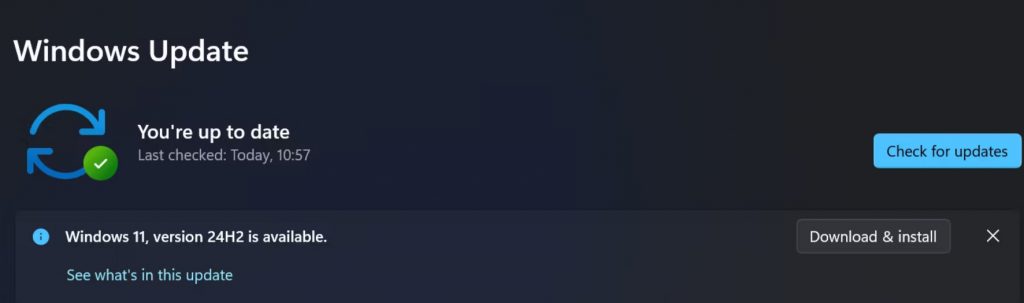 - 出现提示时重启电脑。然后返回“设置”中的“Windows 更新”菜单,点击“检查更新”。你应该会看到下载并安装 Windows 11 版本 24H2 的选项。