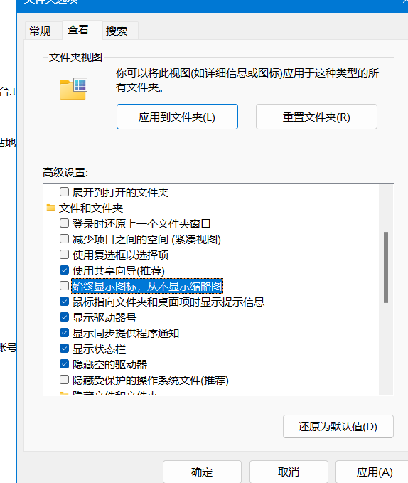 同时勾选「显示缩略图,而不是图标」(Win11 部分版本有这个选项)。 点击「应用」→「确定」